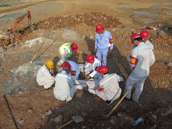 演練模擬礦山施工作業面35平臺進行爆破作業,由于炮孔充填深度不夠,導致沖孔現象,產生飛石,現場管理人員在礦區北側警戒時,被爆破飛石砸中,導致部受傷,傷勢嚴重。總指揮在接到救援電話后,立即啟動三級應急預案,通知辦公室各應急小組就位礦山應急救援隊員攜帶專業救援裝備,駕駛應急救援車,拉警報,火速趕赴事故現場。到達現場后,立即判斷受傷人員傷情,及時救出并進行止血包扎、固定等簡單處理后由救援隊員用擔架抬上120救護車,并送往就近醫院救治演練過程中各應急小組各司其職、協同作戰、反應迅速,整個演練過程在快速、緊張、有序的氛圍中進行圓滿完成了各項預定任務。