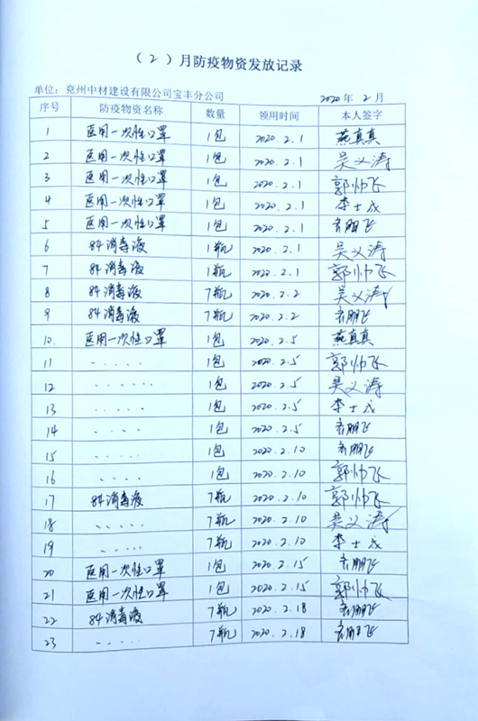 二、建立疫情防控領(lǐng)導(dǎo)小組,確保復(fù)工復(fù)產(chǎn)安全有序 分公司成立疫情防控領(lǐng)導(dǎo)小組,分公司經(jīng)理任組長,組員由已到崗的全體員工組成。領(lǐng)導(dǎo)小組嚴(yán)格按照當(dāng)?shù)卣螅瑖?yán)格落實疫情期間的消殺管控及登記制度,并與當(dāng)?shù)卮逦瘯蠘I(yè)主加強(qiáng)溝通,將感染風(fēng)險降至最低。 三、多途徑購買防疫物資,確保防疫物資供應(yīng) 寶豐分公司復(fù)工復(fù)產(chǎn)前,針對防疫物資緊缺的情況,一方面請求業(yè)主代為購買防疫物資,另一方面請求總公司代為購買。截止2月25日寶豐分公司已購買口罩900個,84消毒液90kg,防護(hù)服8套,護(hù)目鏡8套,酒精5kg,紅外線電子額溫槍1部,水銀體溫計10個;防疫物資準(zhǔn)備充足,滿足1個月用量。  四、嚴(yán)格落實防控措施 (1)開展環(huán)境整治。對辦公場所及生產(chǎn)場所進(jìn)行衛(wèi)生清理;對空調(diào)進(jìn)行清理洗。 (2)滅菌殺毒。每日2次對辦公場所及生產(chǎn)場所進(jìn)行消毒處理,上午7:30至8:00,下午17:30至18:00。