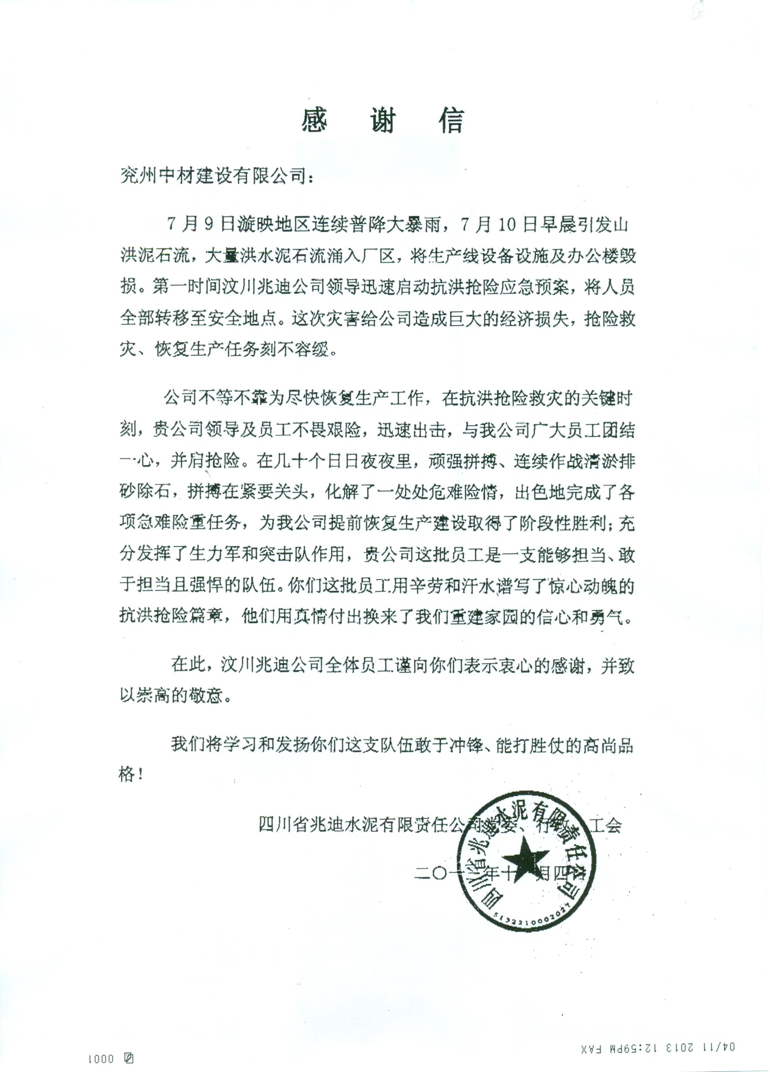 四川省兆迪水泥有限責任公司發來的感謝信!