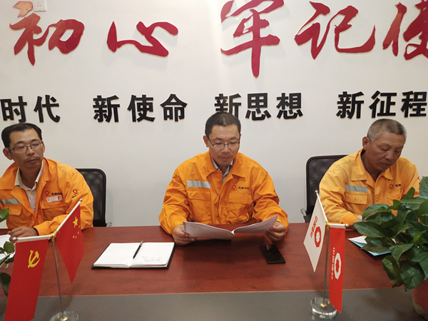 按上級黨委統一部署,寧陽項目部于9月23日晚召開全體員工結合中材礦山劉書記講話精神,開展“不忘初心,牢記使命”主題教育活動。 會上,劉經理首先帶領全體員工認真學習《在中材礦山建設有限公司開展“不忘初心,牢記使命”主題教育部署會上的講話》。全體員工分別針對“不忘初心,牢記使命”主題教育活動展開發言討論。最后,根據《在中材礦山建設有限公司開展“不忘初心,牢記使命”主題教育部署會上的講話》會議精神,劉經理呼吁全體員工要積極努力地向黨靠攏,今后更加緊密團結在以習近平同志為核心的黨中央周圍,高舉習近平新時代中國特色社會主義思想偉大旗幟,扎實做好“不忘初心,牢記使命”主題教育工作,為全面完成集團和股份公司下達的各項經濟指標而努力奮斗,以優異的成績迎接新中國成立70周年   |